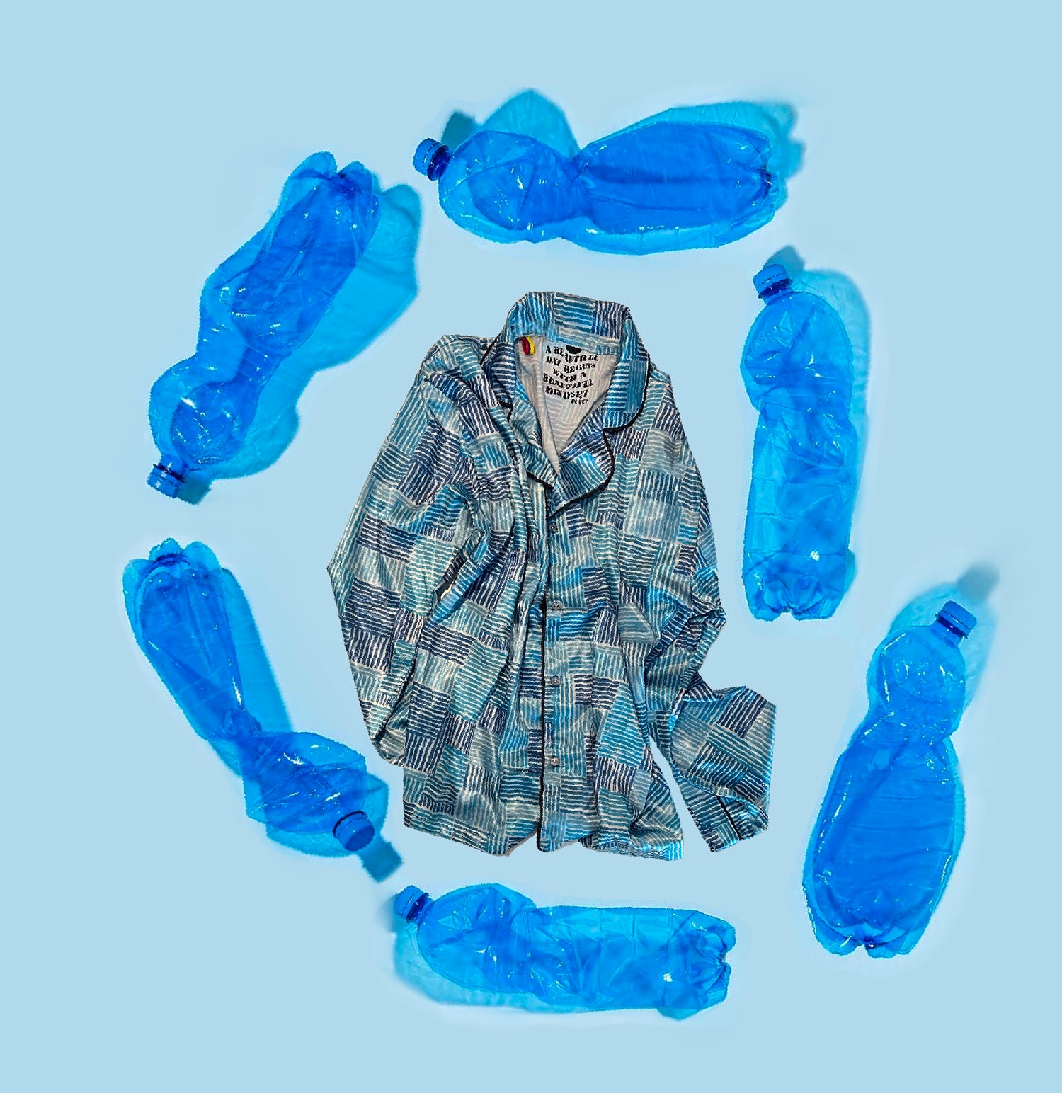 The plastic is reworked and woven Into fabrics. Using recycled polyester requires fewer resources than virgin poly or cotton. It generates fewer CO2 emissions and saves up to 95% of water in production.